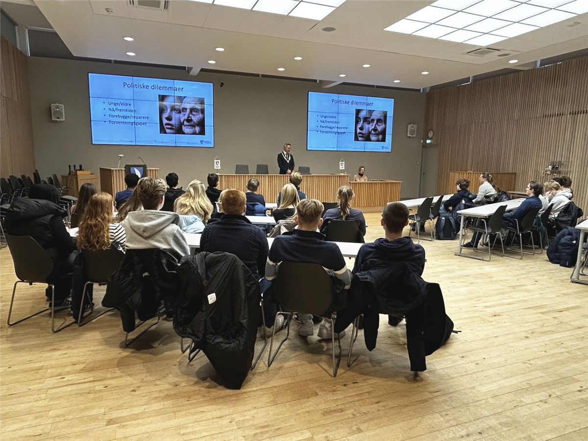 Da de kom til kommunestyresalen, ble elevene delt inn i «posisjon» og «opposisjon» og fikk stille spørsmål til ordføreren før de presenterte argumentene sine i plenum.