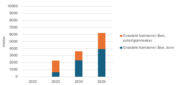 En av de mest tydelige framgangene gjelder antall meter med grasdekte kantsoner langs vassdragene. Fra ingen slike kantsoner registrerte i kommunen, var det i 2025 etablert om lag 6 kilometer.