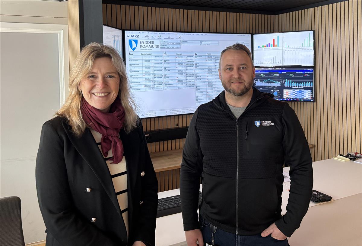 Kommunedirektør Kristin J. Kirsebom og leder byggdrift, Finn Christian Aarum.Under besøket hos eiendomsforvaltningen fikk kommunedirektøren et godt innblikk i systemene for drift og optimalisering av kommunens bygg gjennom avanserte driftssystemer som overvåker, styrer og følger opp energibruk og teknisk drift. Dette har gitt tydelige resultater, blant annet i form av betydelige reduksjoner i strømforbruk ved flere bygg. Arbeidet er tett koblet til kommunens klima- og miljøplan, og byggdrift er en virksomhet som ligger langt fremme når det gjelder kompetanse.