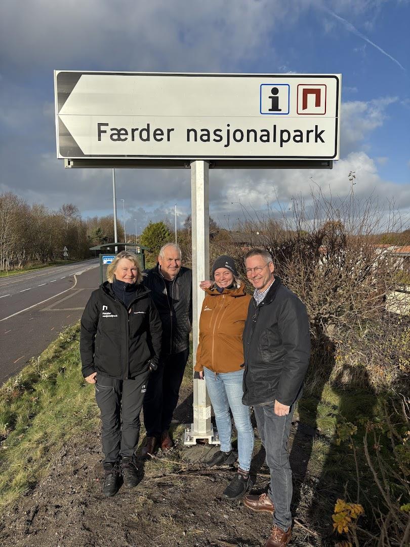 Anne Sjømæling, nasjonalparkforvalter, Knut Anvik, leder av hovedutvalget for Samferdsel i Vestfold, Heidi Karoline Storm, daglig leder Besøkssenter Færder nasjonalpark og Tom Mello, ordfører i Færder og styreleder i Færder nasjonalparkVestfold fylkeskommune har satt opp nye skilt til Færder nasjonalpark.