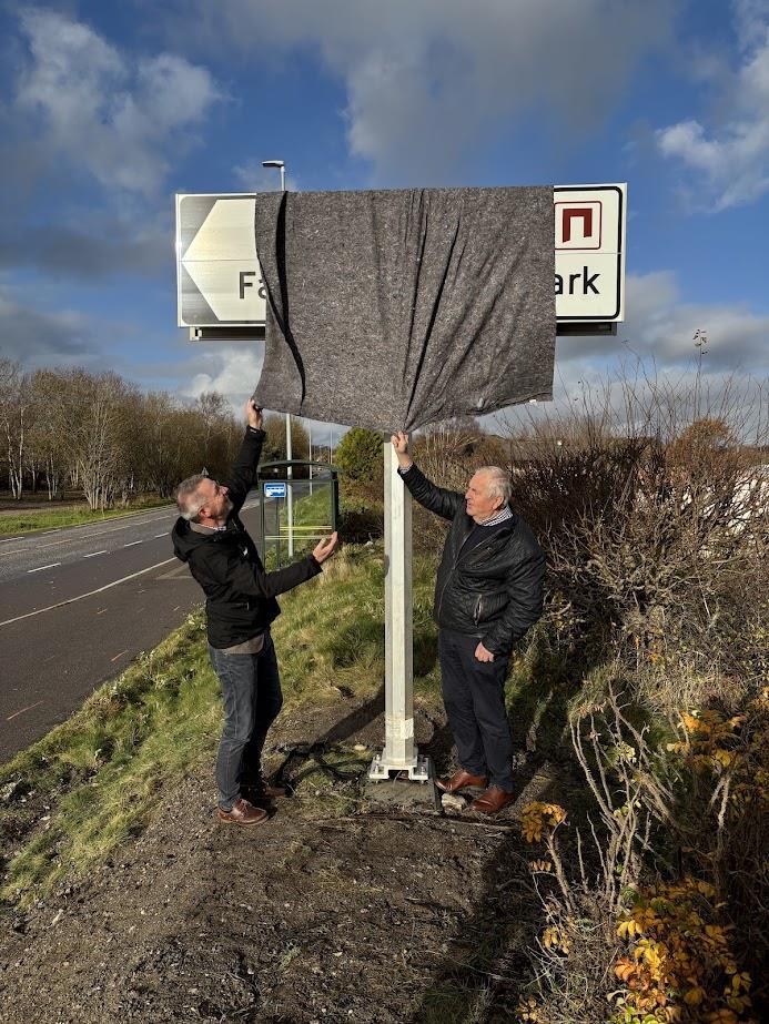 Tom Mello og Knut Anvik avduker skiltet som viser veien inn til Færder nasjonalpark.- Det er helt på sin plass at folk blir bevisste på at det er en nasjonalpark her, og at det kanskje er noe regler som gjelder for nasjonalparken. Dette er ikke kun et friområde, sier nasjonalparkforvalter Anne Sjømæling.