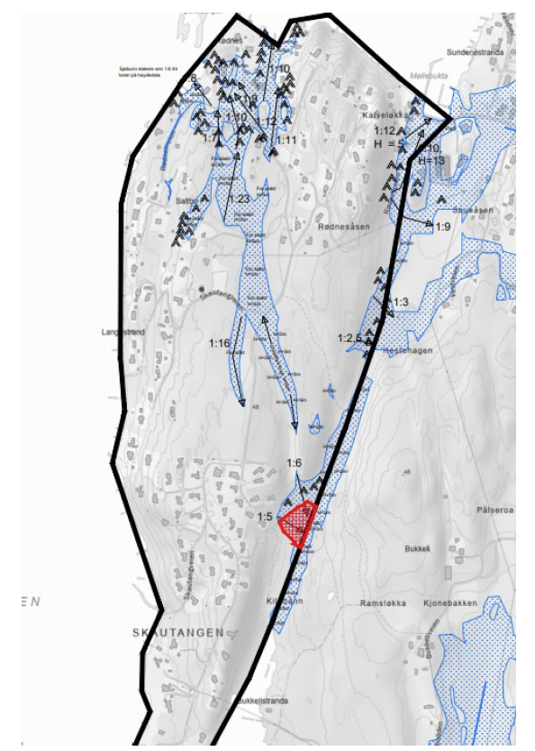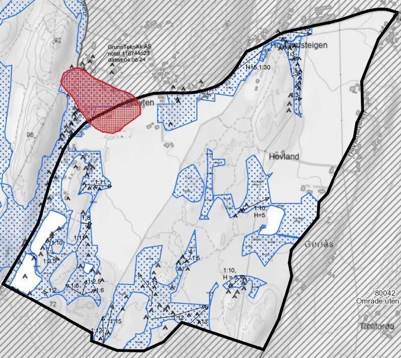Figur 2 - temakart fra NVE 31.08.23. Delområde 3 er markert i sort.Vedlagt tegning nr. 116744-5 viser området med registrerte kvikkleirefaresoner, markeringer for fjell i dagen, utvalgte terrenghelninger, og kjente områder hvor områdestabilitet tidligere er vurdert som tilfredsstillende.