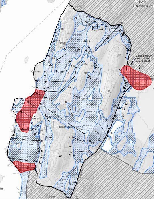 I øst ved Ørsnes (syd for Linde) viser tegningen en faresone sydover mot Engveien/Rosanes. Det er registrert sensitiv og kvikk leire i grunnen, ref. [5], [6], [27] og [28] og topografien tilsier at det er et potensielt løsneområde for skred. Sonen er utredet i ref. [38].