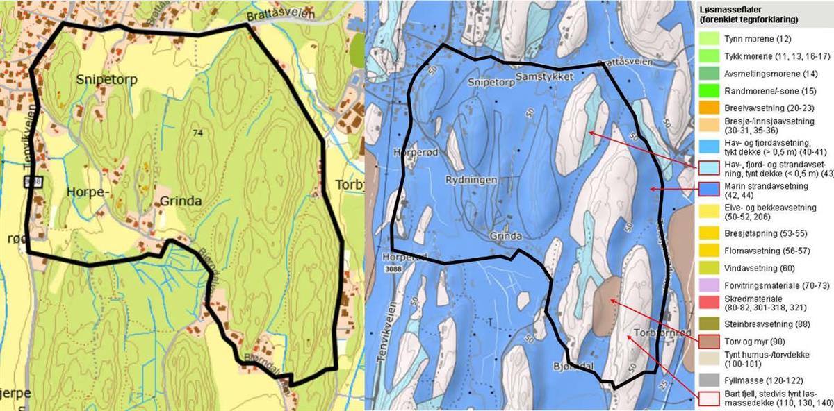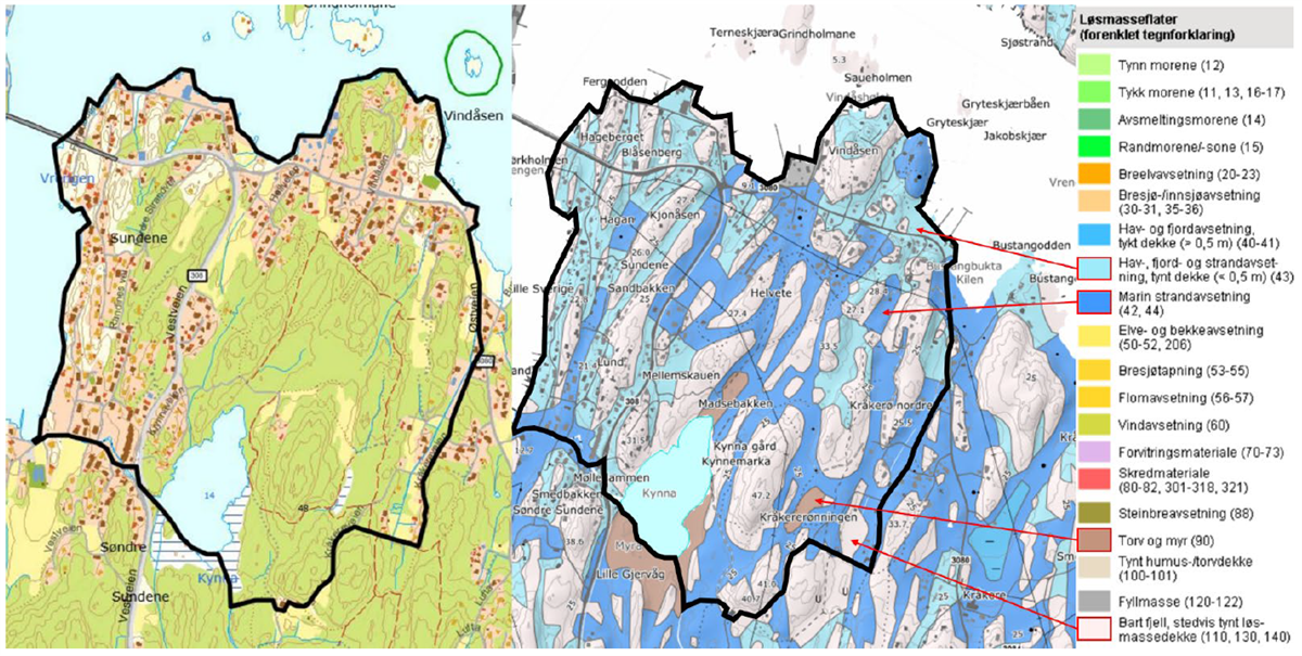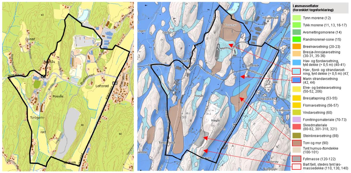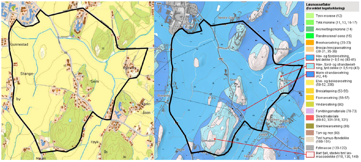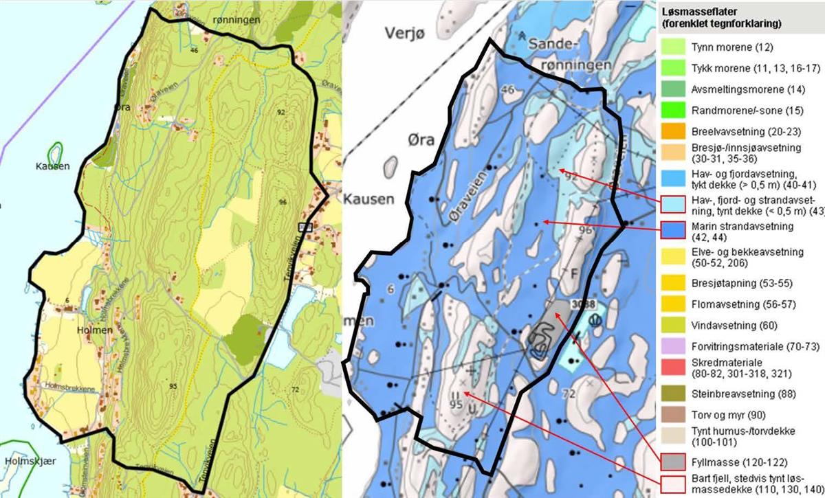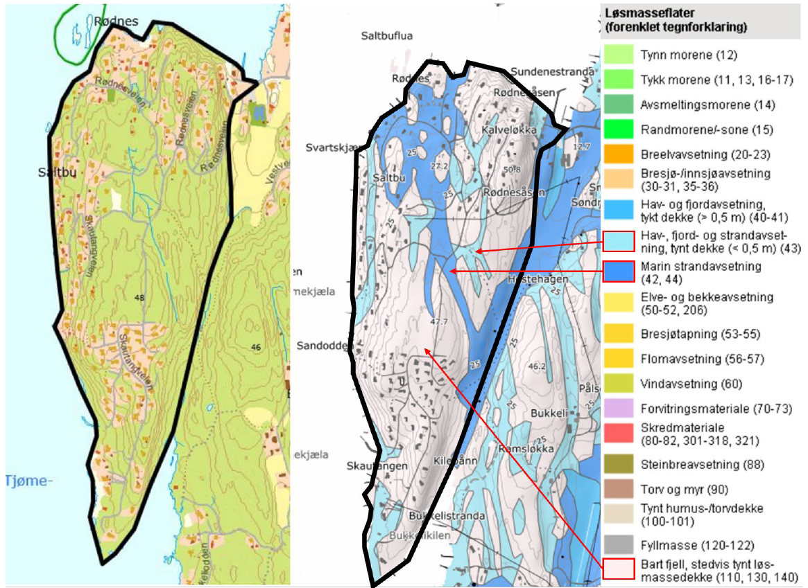 Området ligger under marin grense og store deler av området er derfor markert som områder hvor det må vises aktsomhet i forbindelse med marine avsetninger og leire. Dette gjelder ikke områdene markert som bart fjell eller tynt dekke da løsmassene her har for liten mektighet til at det potensielt kan oppstå fare.