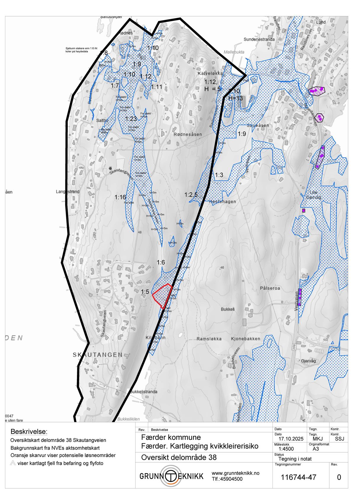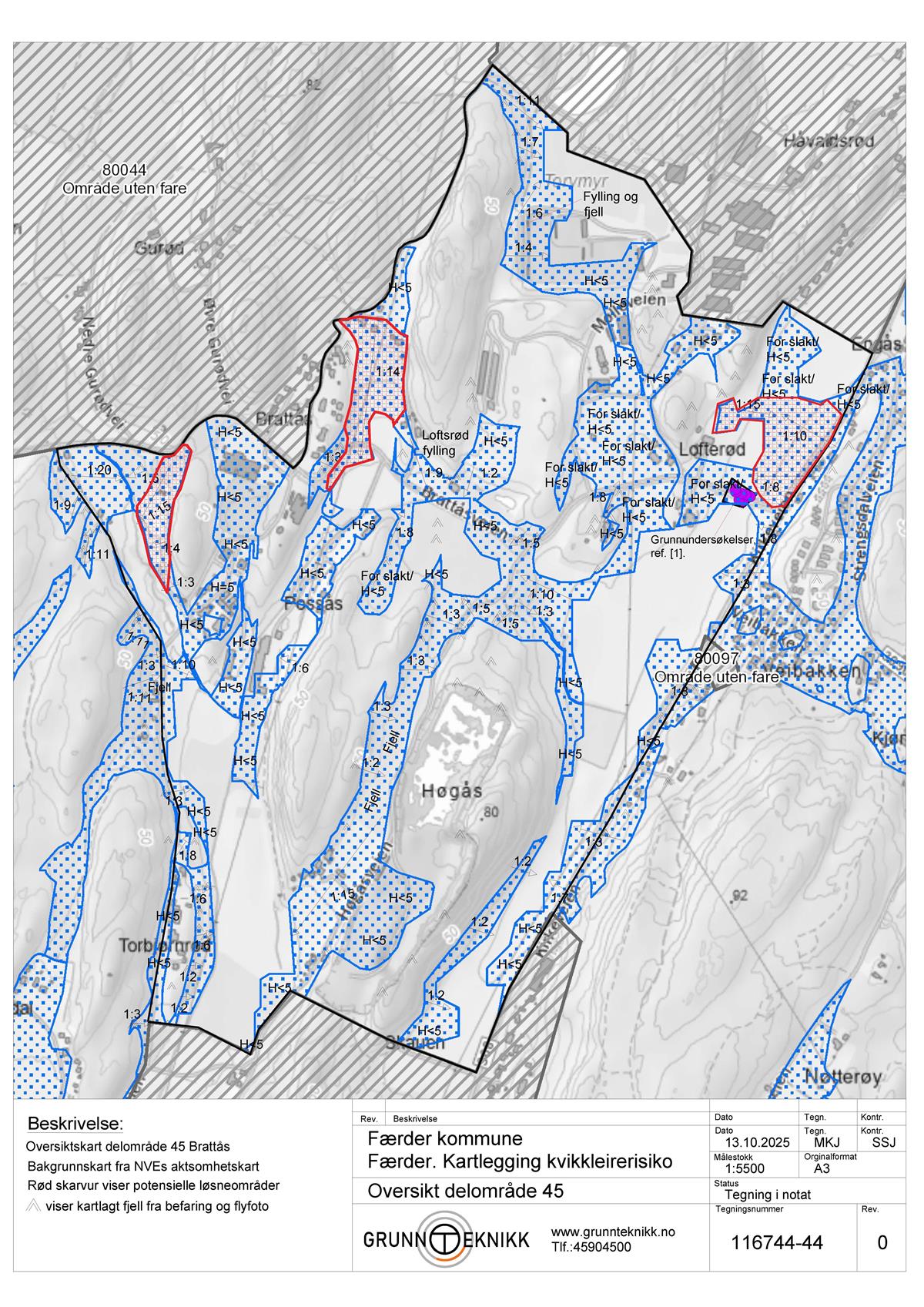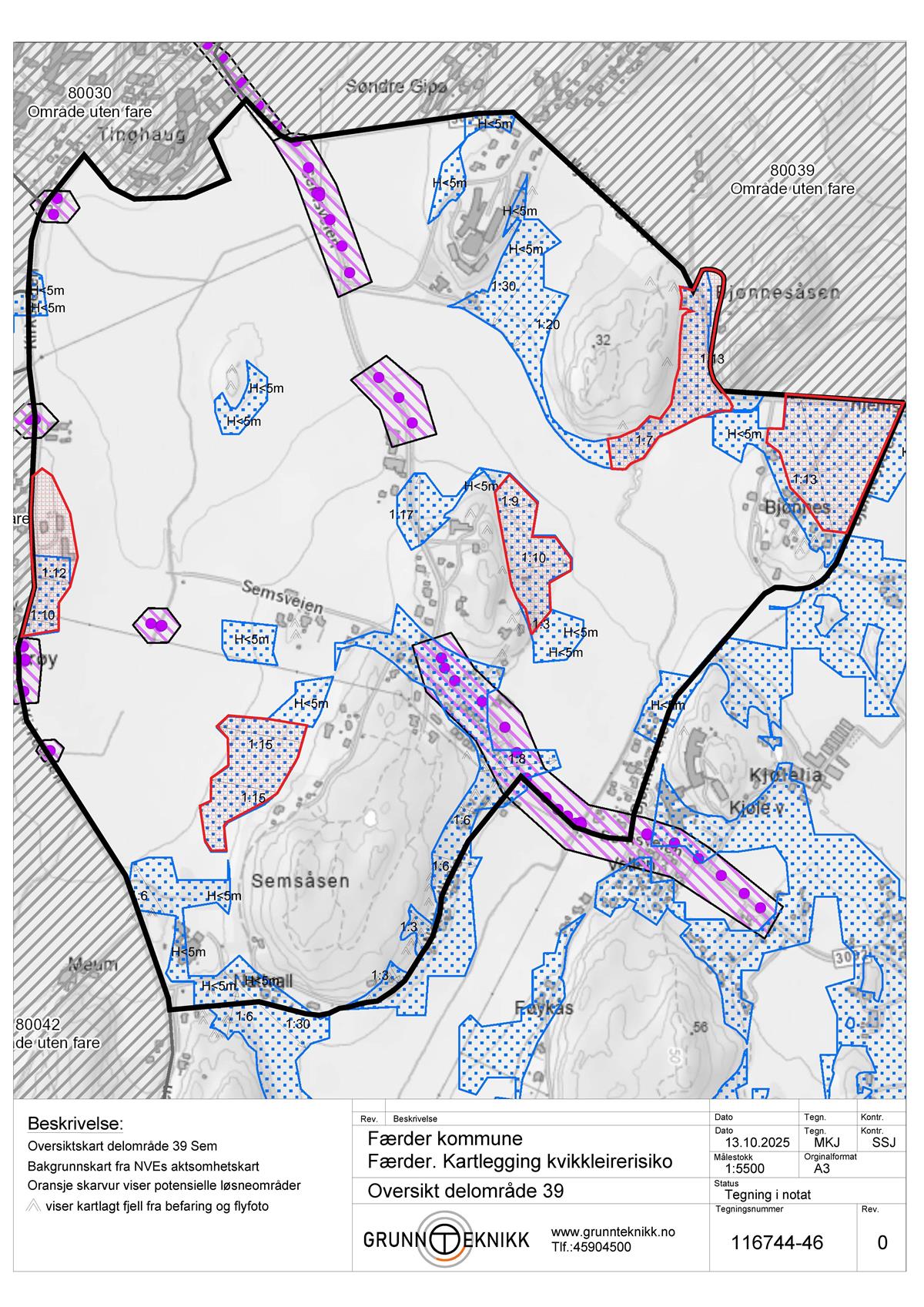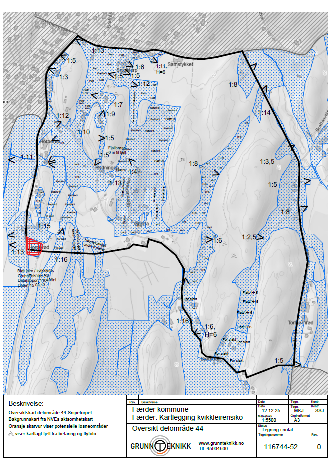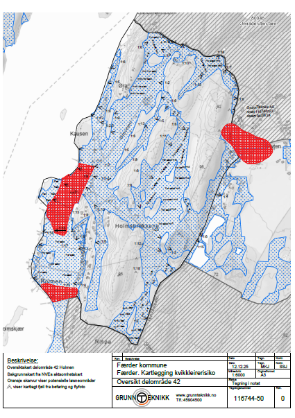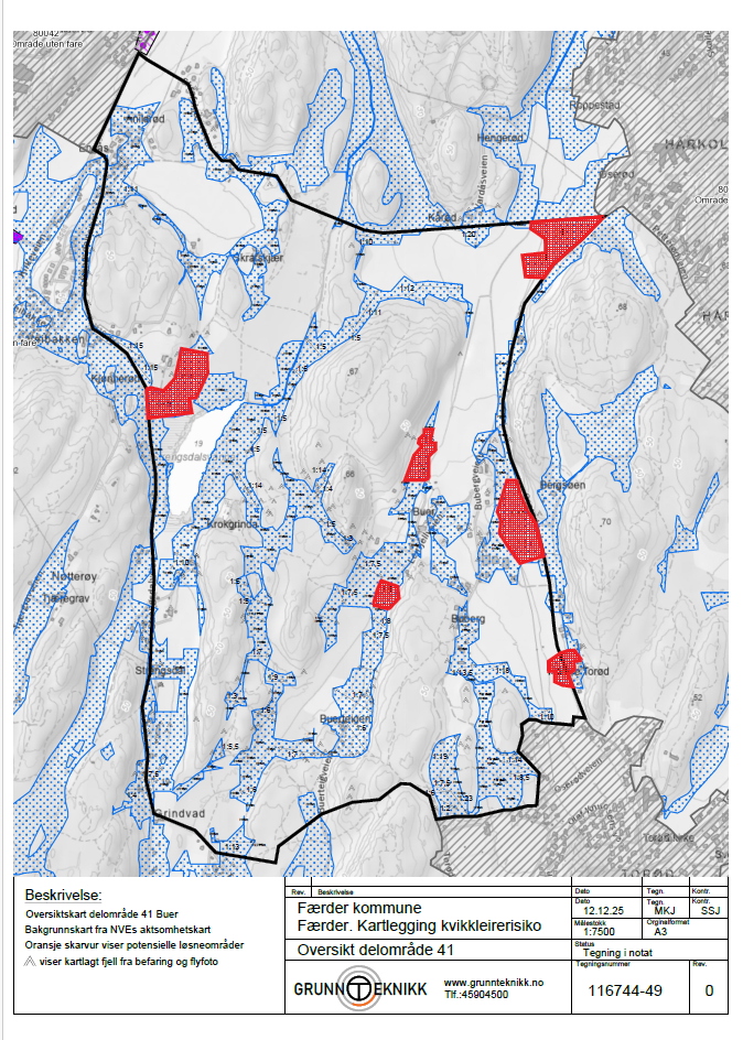 GrunnTeknikk AS er engasjert av Færder kommune til å utføre en kartlegging av 6 delområder iht. NVEs veileder 1/2019 Sikkerhet mot kvikkleireskred, punktene 1-6 «Prosedyre for utredning av områdeskredfare». Vurderingen baseres på kjente grunnundersøkelser i området.