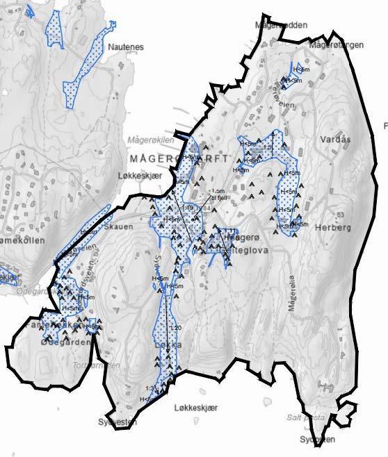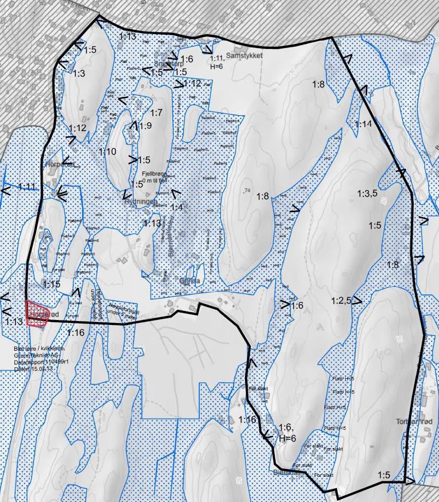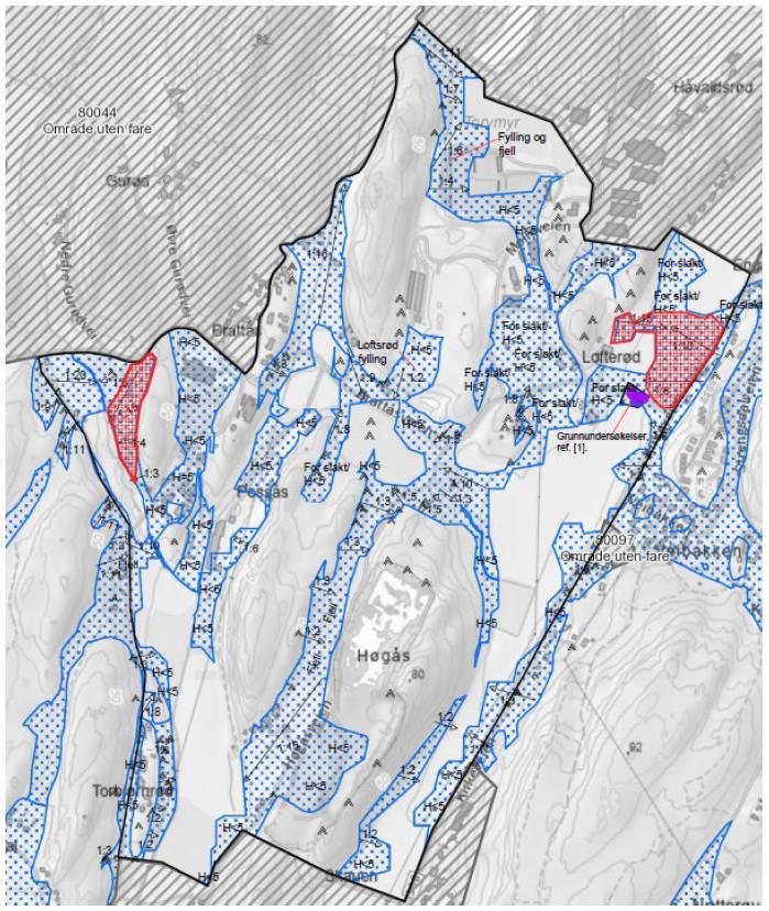 Potensielle faresoner/aktsomhetsområder markert på tegning nr. -5 vil kreve grunnundersøkelser for videre utredning.