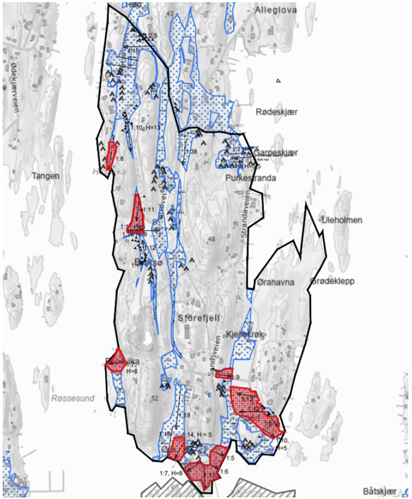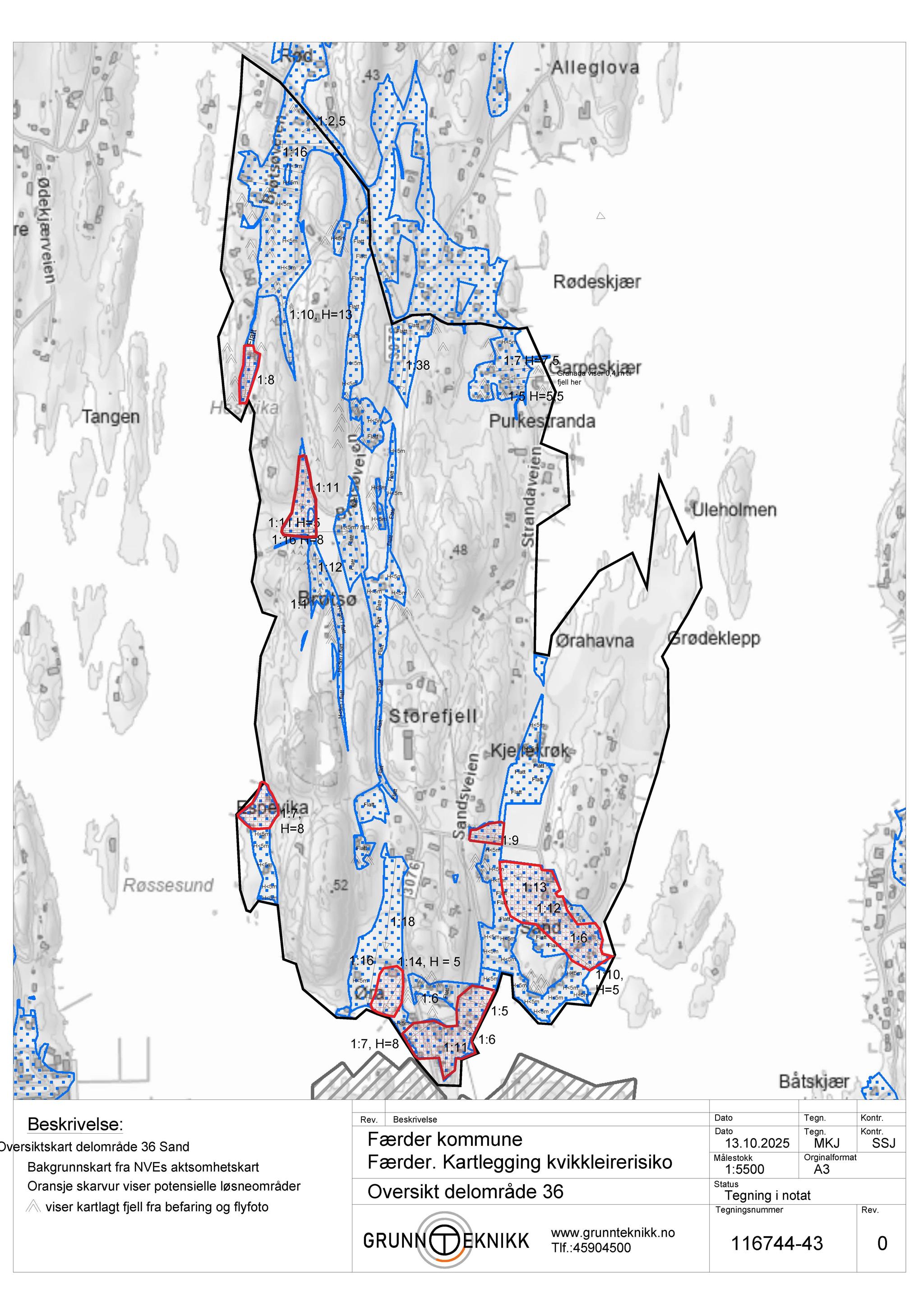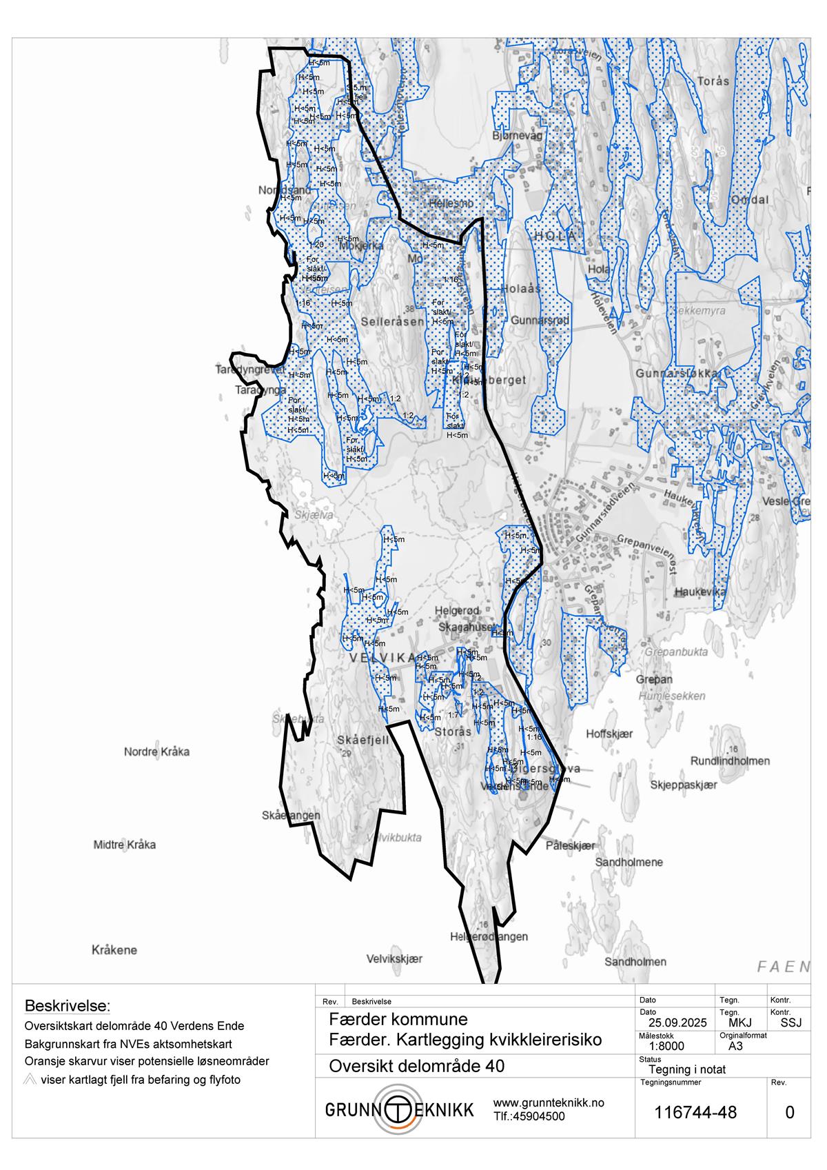 GrunnTeknikk AS er engasjert av Færder kommune v/Morten Fredheim Solberg til å utføre en kartlegging iht. NVEs veileder 1/2019 Sikkerhet mot kvikkleireskred, punktene 1-6 i «Prosedyre for utredning av områdeskredfare» for 6 delområder: