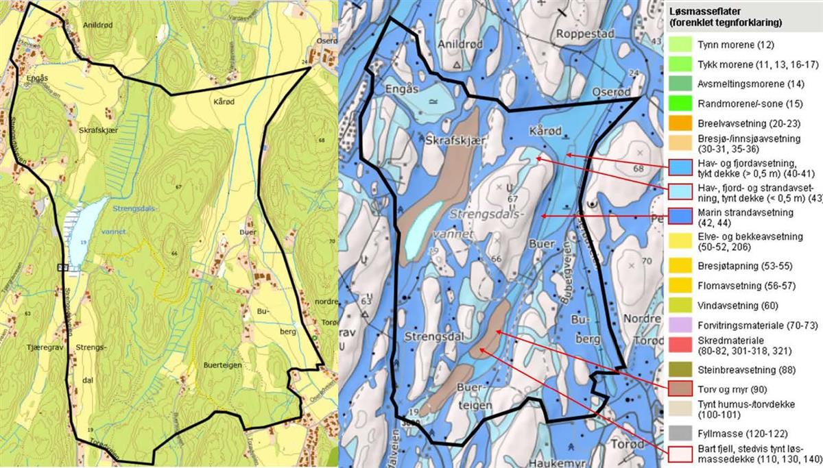 Kvartærgeologisk kart fra ngu.no (høyre)NVEs temakart er vist på figur 2 (lengre ned på siden). Kartet viser at Kvikkleirefaresone nr. 2671 Banebakken (Faregrad Lav, Konsekvensklasse Alvorlig, Risikoklasse 3) strekker seg inn i området i nordvest.